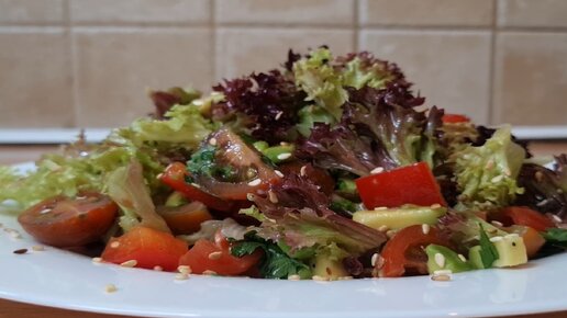Классный салат из авокадо, листьев салата и овощей заправленый соком свежевыжатого лимона.