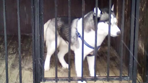 Хаски высоко прыгает в вольере