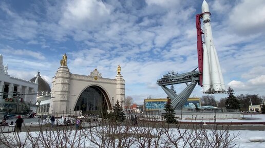 Прогулка по Площади Промышленности, где установлен макет ракеты Восток. Вид на павильон космонавтики и авиации.