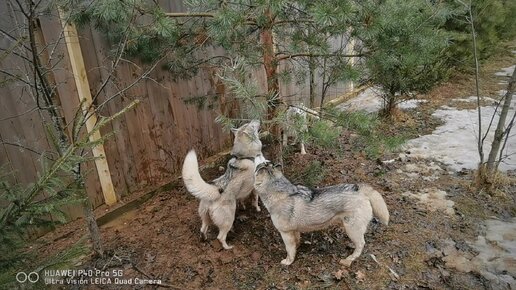 Крики хаски и дикий вой, подумал драка а это - 6 хаски устроили охоту за котом и загнали его на дерево.