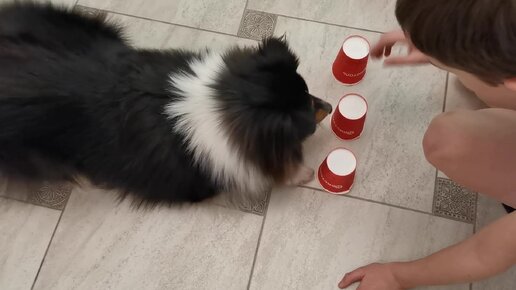 Сын спрятал корм под стаканчиком, найдет ли наш пёс? :)