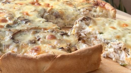 Открытый пирог с курицей и грибами в сливочно-сырной заливке.