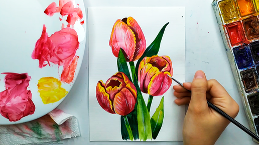 Как нарисовать тюльпаны акварелью поэтапно. Рисунок на 8 марта. Акварель для начинающих