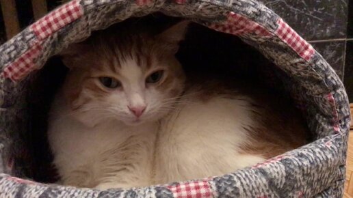 Кошка Рыся в домике уютно разместилась, как в норе
