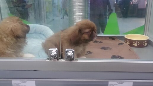 Пекинес в зоомагазине. Щенки за стеклом.
