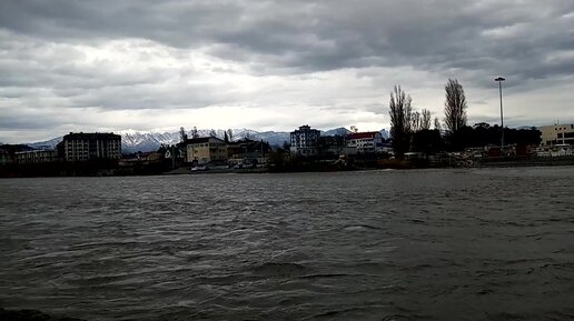Бурные потоки из реки Мзымта впадают в Черное море во время шторма.