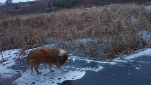 Наш пушистый друг боится выходить на лёд, но упорно борется со своим страхом