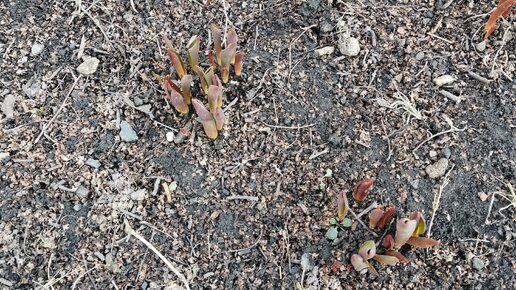 У бабушки в палисаднике "просыпаются" тюльпаны