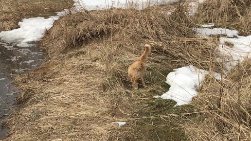 Пришли с котом Рыжкой к пруду , он еще покрыт толстым льдом
