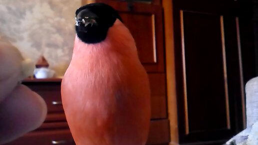 Домашний снегирь поёт. А второй ест с руки грецкий орех.