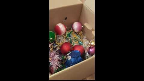 Забавное видео. Пушок помогает разбирать елочные игрушки. Котенок играет с коробкой елочных игрушек.