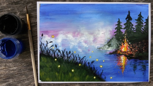 Рисую очаровательный ночной пейзаж: туман, озеро, костер