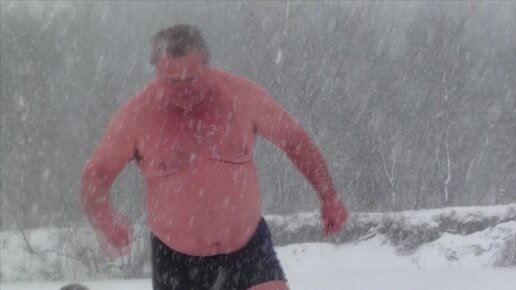 Мужик идёт по снегу босяком и в одних шортах