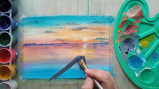 Рисую романтичный желто-фиолетовый закат, озеро и мостик