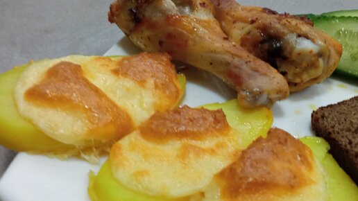 Запеченный варёный картофель под сырно-чесночной шапочкой с куриными ножками