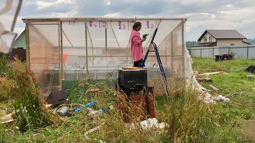 Переделываю навес для бассейна. Снимаю рваную стрейч пленку и прикрепляю поликарбонат