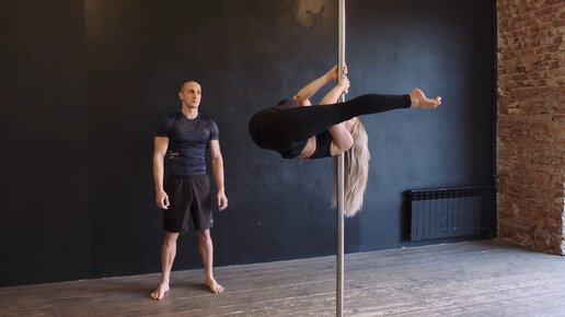 Гимнастка обучает элементам на пилоне. Пытаюсь повторить каждый элемент