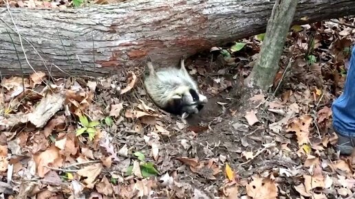 Пухлый енот застрял под упавшим деревом. Прохожие его спасли