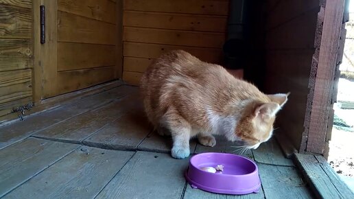 Дачный кот, когда ест, чавкает и урчит от удовольствия
