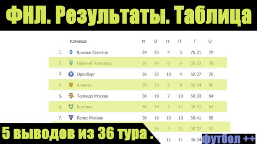 Футбол России. Подводим итоги 36 тура ФНЛ. Результаты, расписание, таблица
