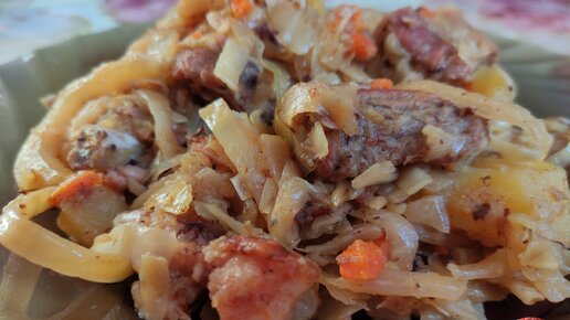 Муж готовит в казане очень вкусное блюдо из капусты и свиных ребер.