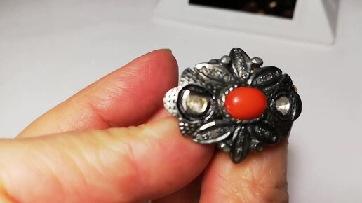 Редкое кольцо с кораллом красным и алмазами с огранкой Индия.