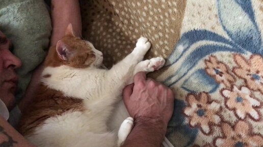 Пока хозяин спит , кошка Рыся к нему под бок улеглась