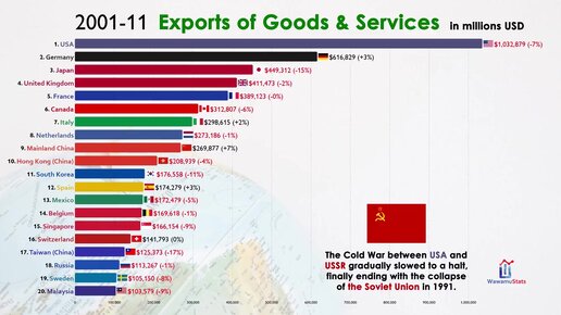 20 крупнейших стран-экспортеров (торговых) в мире (1970-2021)