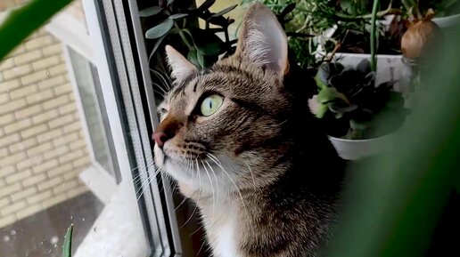 Кот охотится за снегом через окно