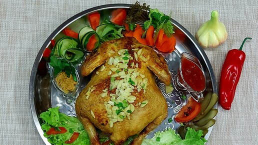 Курица фаршированная с овощами и запаренная в чесночном соусе в казане