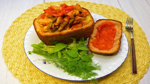 Жаркое с курицей и овощами в хлебе.