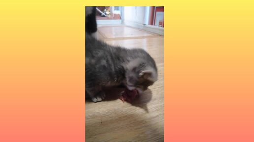 Котёнку достался первый в его жизни кусочек мяса. Но рядом оказался кот. Что сделал котенок