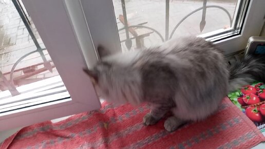 Киска Умка хочет выйти на улицу.