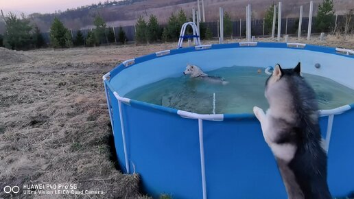 Папа, а почему хаски сами прыгают в бассейн? Не знаю, наверное они пепегрелись.