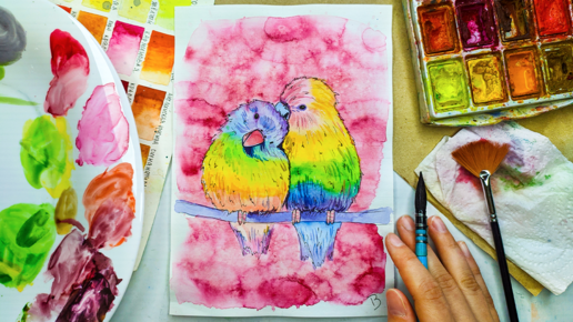 Как нарисовать попугаев акварелью поэтапно. Рисунок на день святого валентина. Акварель для начинающих