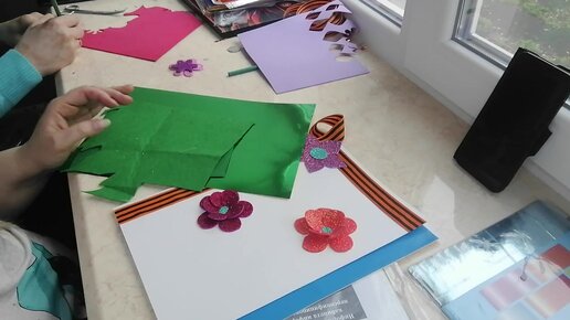 Делаем из фетра блестящего цветы и приклеиваем к открытки для ветерана