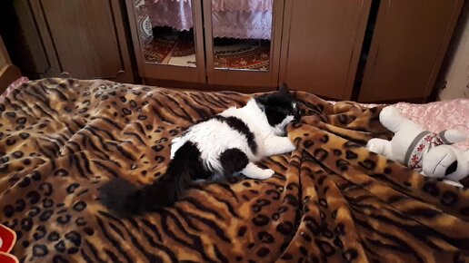 Кот вцепился в одеяло и делает массаж лапами