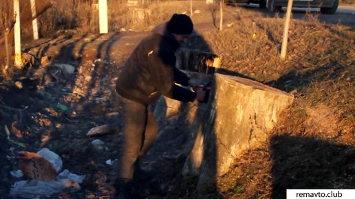 Бензопилой пилит старый трухлявый пень который как губка впитал много воды