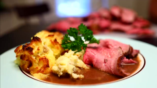 Домашний ростбиф с грибным соусом и запеченным пюре