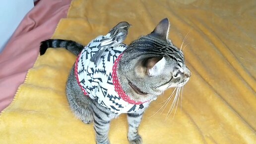 Кот катает воробья на своей спине