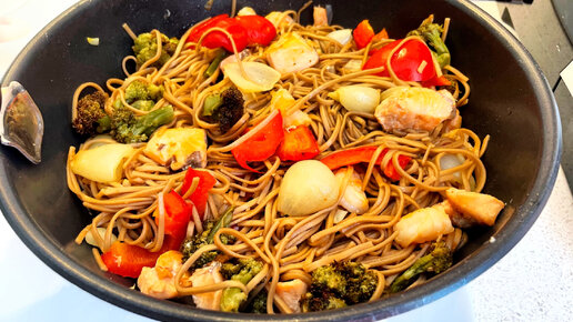 Влюбилась в это блюдо - гречневая лапша (соба) морепродуктами и овощами. Можно на диете!