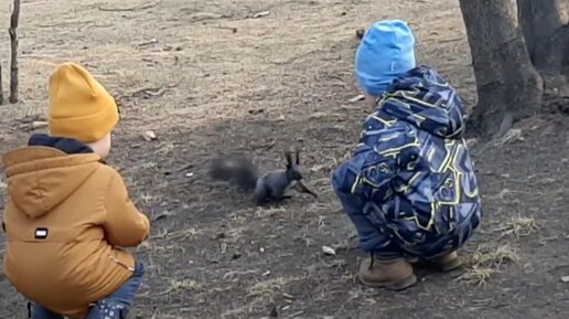 Замучали белку угощением. Зимой была рада детям, сейчас убегает