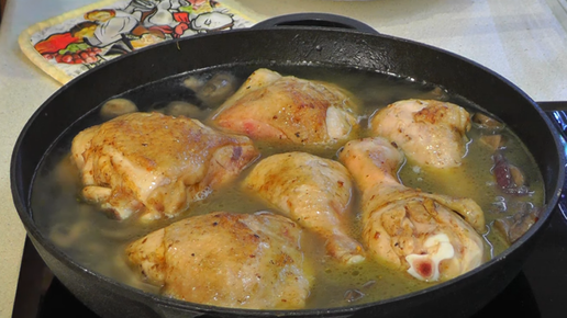 Курица с грибами в чугунной сковороде.