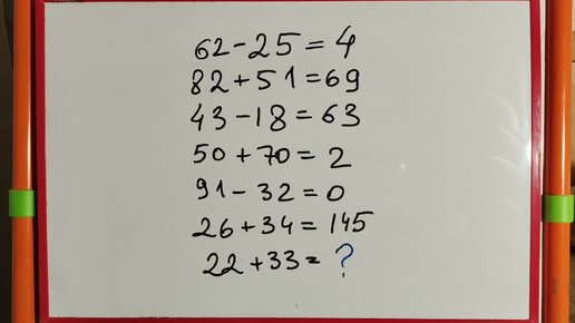 Чему равно 22+33, если 62-25=4?