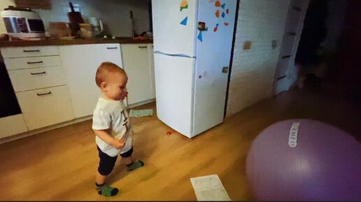 Малыш забивает голы и финтит на воображаемом поле (сестра помогает)