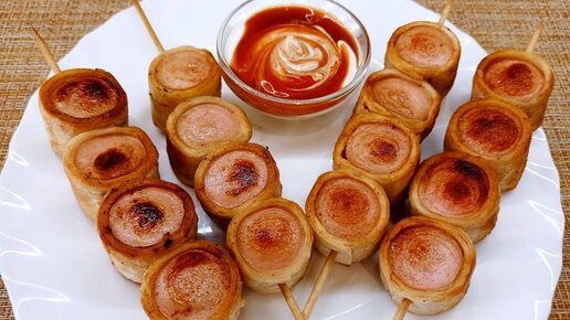 Сосиски в лаваше на шпажках. Вкусно и быстро.