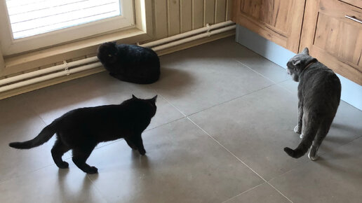 Две бездомные кошки (мама и сын) у нас в гостях. Кошка возмущается, несмотря на спокойный нрав нашего кота.