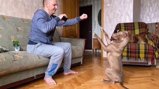 Щенок питбультерьер показывает Зайку