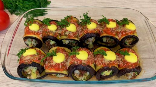 Роллы из баклажанов, запеченные в духовке под томатным соусом.