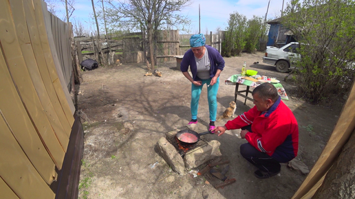 Котлеты из капусты, фарша и яйца. В сковороде на костре.